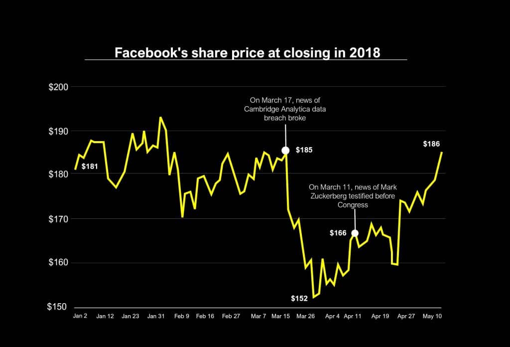 בגרף ניתן לראות את הצניחה במחיר במנייה, שמייצג את איבוד אמון המשקיעים בחברה, כשהפרשה נחשפה בשנת 2018.