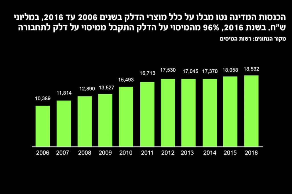 בתרחיש של חדירה מסיבית של כלי רכב חשמליים, הכנסות המדינה ממיסוי על דלק לתחבורה צפויות לרדת באופן משמעותי, עד שייעלמו לגמרי, כך לפי הדוח שפורסם. הירידה הדרסטית הצפויה בהכנסות המדינה היא עניין חשוב שיש לתת עליו את הדעת.